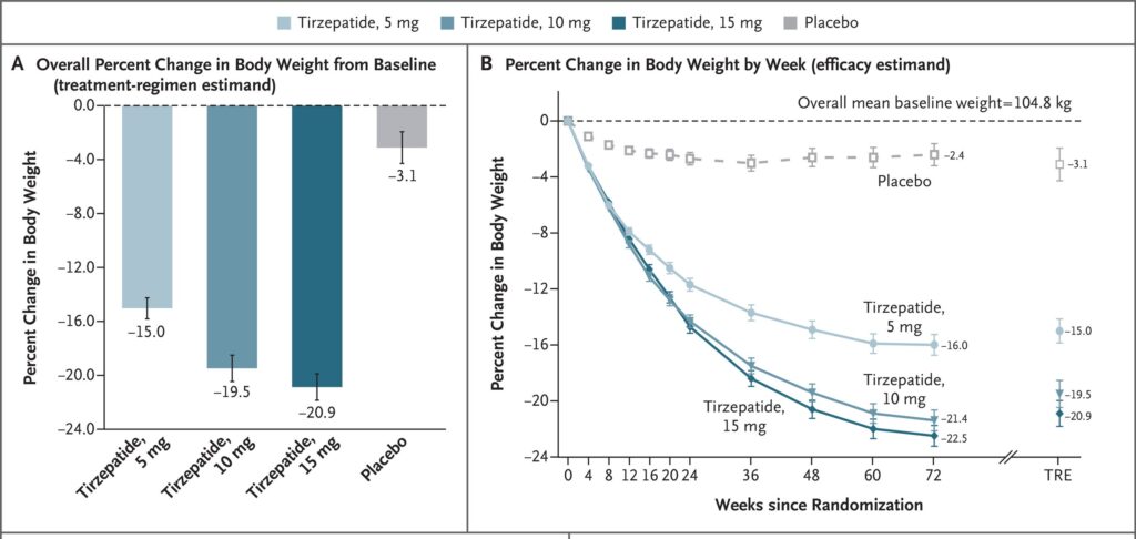 - 内容: ライフスタイルの改善(食事・運動)をベースに、週1回のマンジャロ(5mg、10mg、15mg)またはプラセボを投与しました。