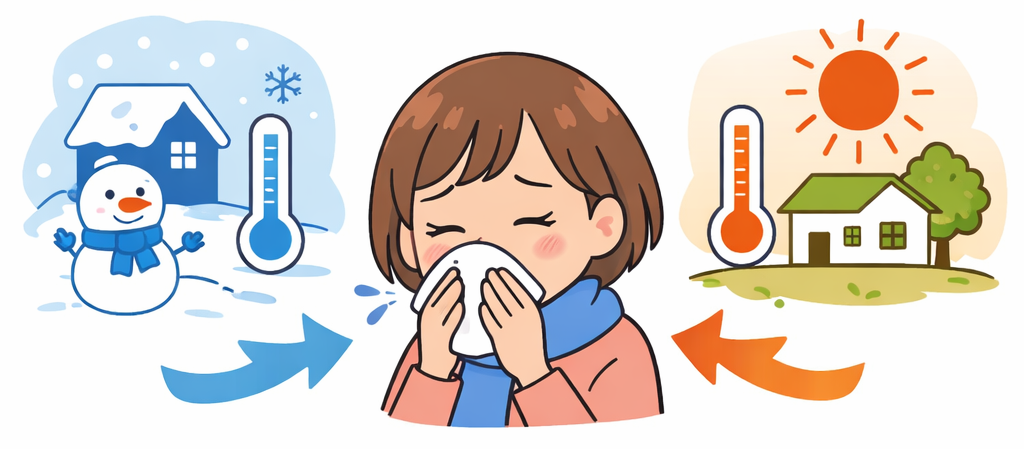 主な原因は、急激な温度差による自律神経の乱れです。鼻の粘膜の血管は自律神経によって調節されていますが、短時間で気温が大きく変化すると(一般に7℃以上の温度差が目安とされます)、この調節がうまく働かなくなり、鼻水・くしゃみ・鼻づまりなどの症状が出現します。